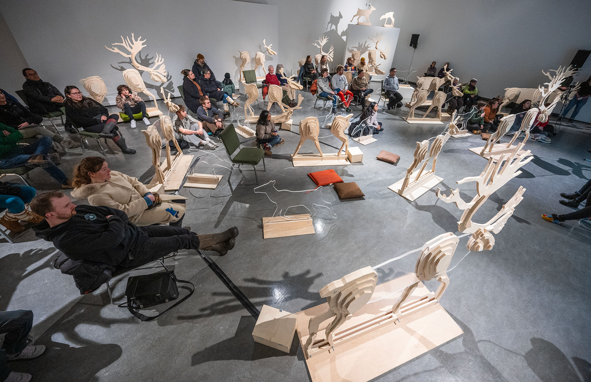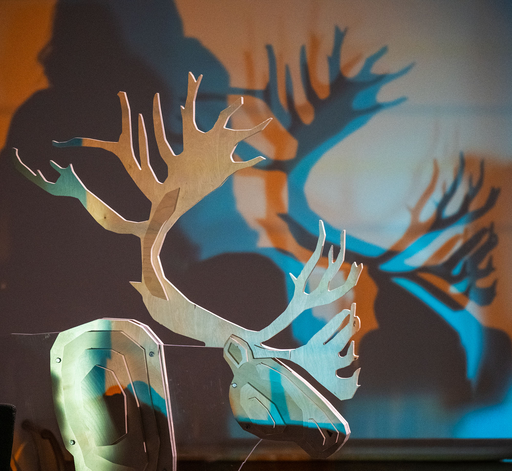 The evening wrapped up with a chance to see the caribou come to life through sound, light, and storytelling. Artists Lianne Charlie and Nicolas Hyatt, co-leads of The Caribou Art Project shared more about the art installation and how the herd has grown. Caribou are carefully laid out, so that when you enter the exhibit you start walking in step with them. The cows and calves are in the centre. Fifteen speaker boxes placed throughout the room play stories and music.